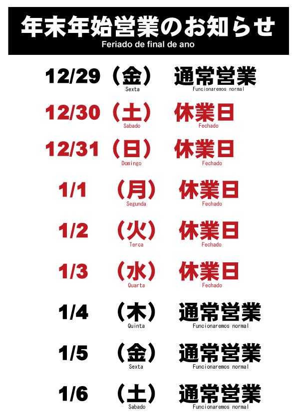 連休中のご注文やお問い合わせにつきましては1月4日(木)からの業務開始日より順次ご対応させて頂きますので宜しくお願い致します。